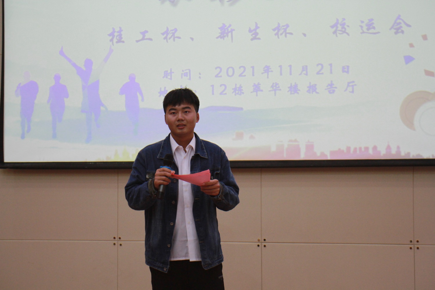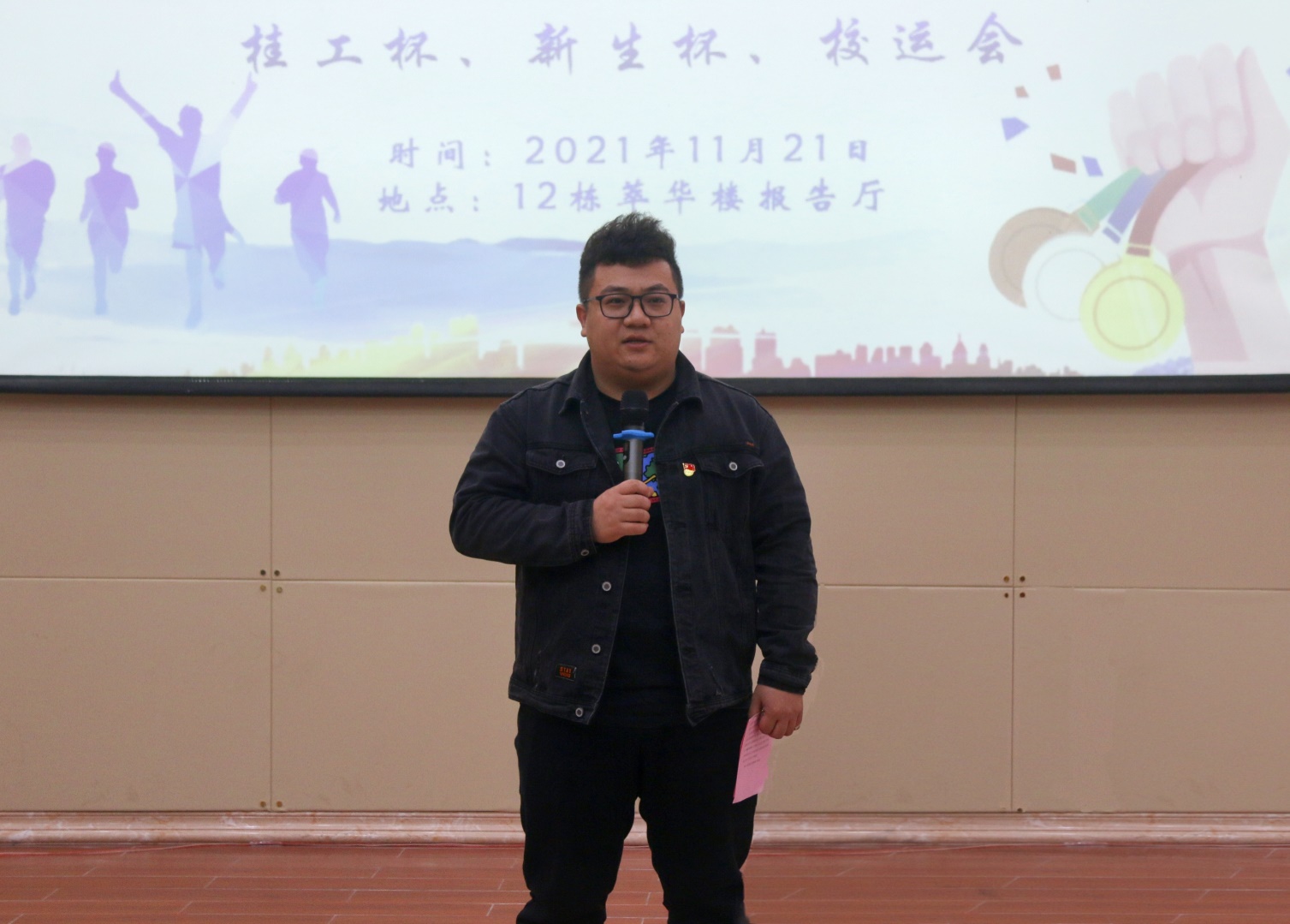 会议伊始,学院团委副书记王凯浩老师对本次校运会作总结性发言,他对本次校运会中,学院取得的优异成绩给予了充分肯定,高度赞扬了运动员在赛场上的卓越表现,并向所有为校运会辛勤付出的各位老师和同学们表示感谢。接下来,老师们分别为校运动会中获得名次与荣誉的同学进行颁奖,同时给“桂工杯”篮球赛、“桂工杯”足球赛、“桂工杯”排球赛、“新生杯”篮球赛、“新生杯”排球赛、“新生杯”足球赛的训练负责人发放聘书。随后,学院运动员代表刘清宏同学发言,他非常感谢学院对运动员们的大力支持,感谢为运动会辛勤付出的全体工作人员,并表明决心,明年会更加努力,为学院光荣墙添砖加瓦。