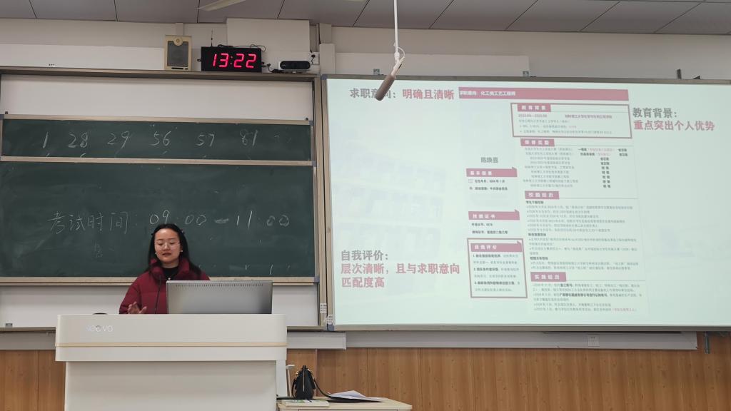 首先,马老师简要分析了当下就业环境和形势,提醒同学们要扩大自己的择业面,提前做好规划,准备好求职材料。接着,她从简历的基本信息、求职意向、教育背景等10项内容为同学们详细解释说明。她强调,第一,在保证个人信息准确的条件下,要学会扬长避短,运用Star法则通过简历讲好故事,简历字体字号选择应恰当,内容严禁出现口号、理念;第二,在简历的准备和制作中应根据用人单位的需求而打造自己的专属简历,重点描述好项目经历等;第三,要注意邮箱命名方式、手机号编写以及兴趣爱好描述等细节的填写方式。