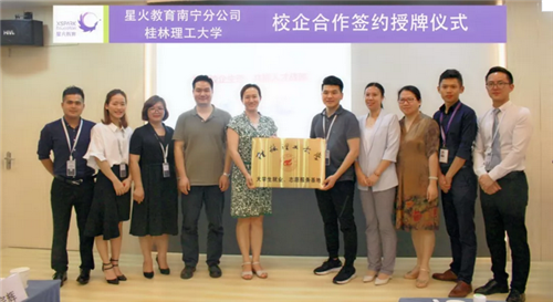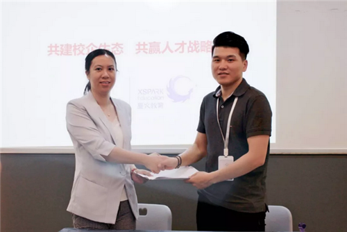 与星火教育南宁分公司总经理叶健锋老师签署实习实践基地协议书,并进行授牌仪式。双方表示非常期待接下来的合作,希望未来有越来越多优秀的毕业生加入星火教育,也希望星火教育能定期反馈校友在星火教育的发展情况等,学校方面也将提供更多的服务,帮助学生和企业相互促进和相互成就,建立完善的校企合作体系。