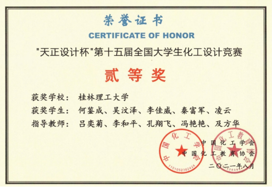 SeedHub组织化学工程与工艺专业2018级26支队伍参赛,由李和平、吕奕菊、王晓娟、黎燕、王桂霞、姚金环、杨文、冯艳艳、刘峥、及方华等老师组成的团队进行指导。2018级卓越班本科生何鉴成、吴汶泽、李佳威、秦富军、凌云组成的代表队设计的作品“南京扬子石化有限公司年产8万吨异丙醇” 经过师生共同努力,以其出色的设计作品和精彩的线上现场答辩脱颖而出,勇夺赛区一等奖,荣获全国总决赛二等奖。同时,我校还获得全国二等奖1项、三等奖5项、华南赛区三等奖7项,在获奖比例与数量上均为历届参赛最好成绩。获奖情况如下: