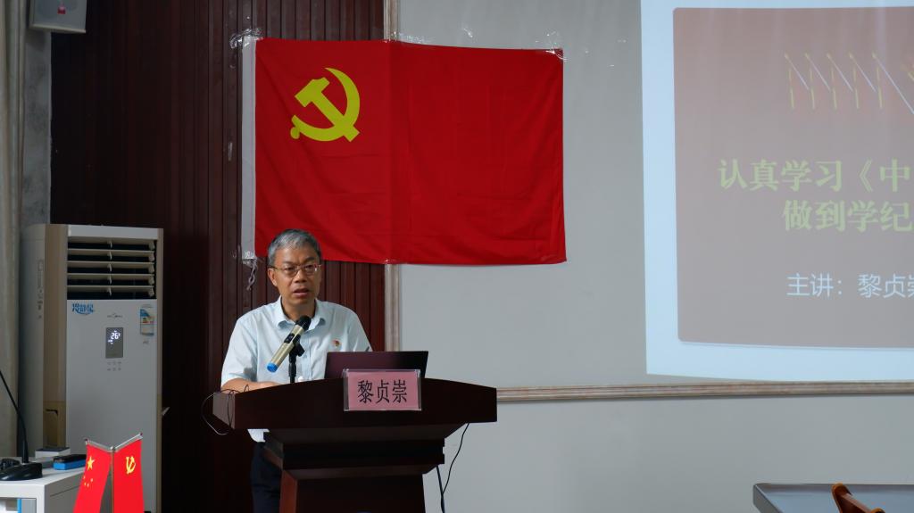 课上,黎贞崇首先介绍了《条例》修订的历史沿革及重要意义,从严明政治纪律和政治规矩、加强全方位管理和经常性监督、引导激励党员干部敢于担当、积极作为、坚持党性党风党纪一起抓、促进执纪执法贯通五个方面介绍了《条例》修订的主旨要义,详细分析《条例》修订的主要内容。随后通过典型案例分析深入解读了党员应恪守的六大纪律,并详细介绍如何处理好从严监督与担当作为之间的平衡关系。最后,黎贞崇强调,在新的征程上,我们需要不断深化对党纪的认知,全面加强党的纪律建设,通过强化自我监督与人民监督相结合的方式,维护党的纪律和规矩。