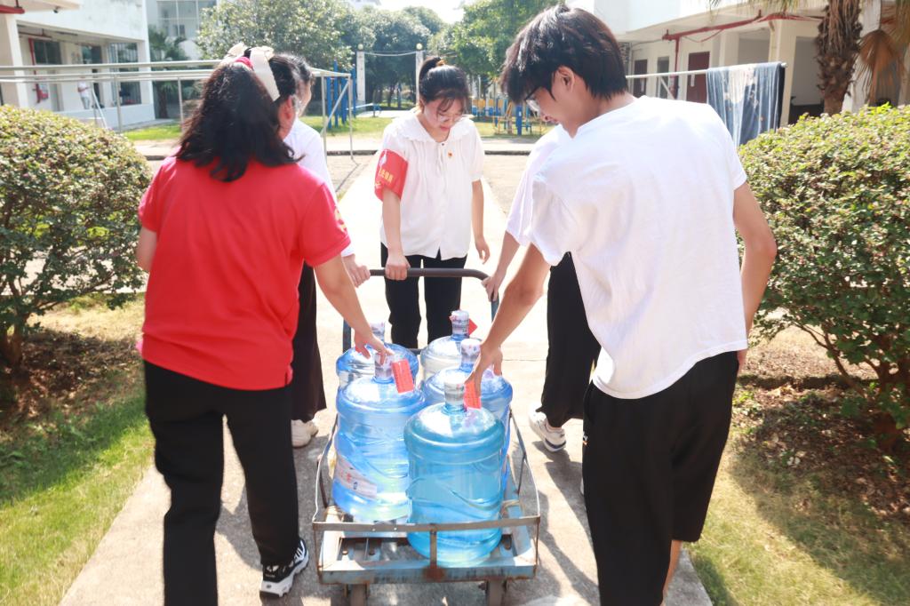 党建办有序的安排党员为已经报道的新生们送水,即使楼层高,纯净水重,也依旧阻挡不了党员同志的热情。