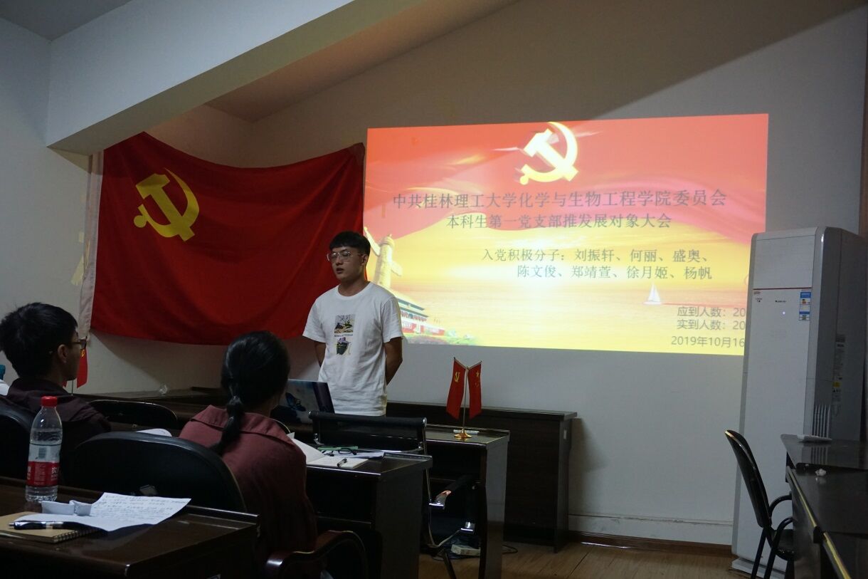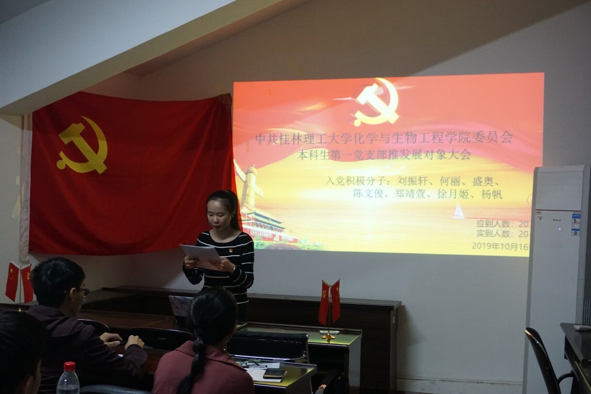 会议开始,由陈楠同志宣读大会议程,说明发展对象推优的重要性以及本次大会的目的。接着入党积极分子分别上台陈述入党动机、对党的认识,并总结自己在成为积极分子一年来,在思想、工作、学习、生活上的改变,开展批评与自我批评。在每个入党积极分子陈述结束后,支部的党员与预备党员对其陈诉内容进行提问考察,提问内容涉及时事政治、工作、生活、党的理论知识、学习,期间党员同志对各入党积极分子所存在的问题提出建议以及改正方法。最后由全部党员同志讨论投票表决,经过慎重的考虑与长时间的考察,最终何丽、陈文俊、郑靖萱、杨帆四人全票通过成为发展对象,而刘振轩、盛奥、徐月姬三人分别有三票弃权而不能成为本届发展对象。