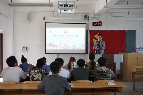 会议伊始,黄道坤书记就此次十九届四中全会的深远意义及其中的重大决策进行了总结讲话。黄道坤指出,此次四中全会围绕研究坚持和完善中国特色社会主义制度、推进国家治理体系和治理能力现代化若干重大问题,作为学生党员,我们应该时刻关注国家动向,不落后任何一步,这也是我们此次学习会的目的。接着黄道坤从六大创新点向支部同志解读十九届四中全会。黄道坤强调全体党员应与党中央的决策保持高度一致,要坚持中国特色社会主义制度,认真履行自己的职责。