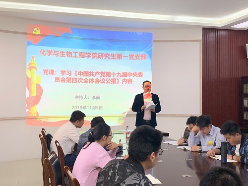 党委副书记、支部书记李南于11月5日中午在12217会议室为研究生第一党支部全体成员做了题为:学习《中国共产党第十九届中央委员会第四次全体会议公报》的党课。