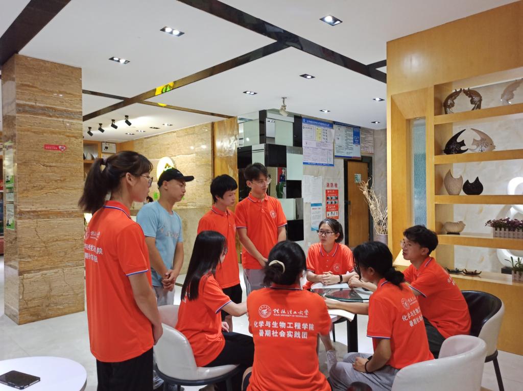 7月14日上午实践团成员来到了他们的最后一站——中铝广西有色稀土开发有限公司。在郭怀兵工程师的带领下,成员们走进实验室现场参观氧化锆产品的生产工艺流程。在实验室,团队成员同企业工作人员就ScSZ粉体的生产工艺设计进行了交流。通过企业工作人员的一番解答,团队成员对于稀土原材料加工和应用有了进一步的认识。
