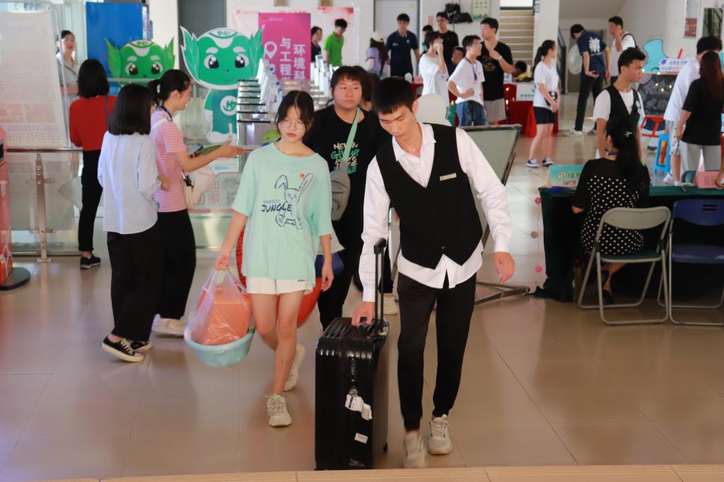 迎新期间,志愿者们在学校迎新点等待新生的到来。每当有一位新生到来,志愿者们便热情向前,引导他们至大本营放置行李,带领他们完成报到,并协助新生搬运行李到新生宿舍。在这一流程中,志愿者们热情地解决新生遇到的问题,尽管烈日当头,汗如雨下,志愿者们仍默默坚守,任劳任怨。