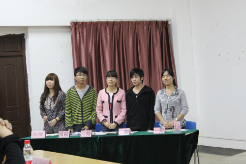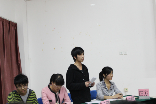 饶筠筠老师、杨建辉老师、何宗辉老师以及09级优秀学生代表秦冬霞同学与12级全体同学一起观看了本次辩论赛。