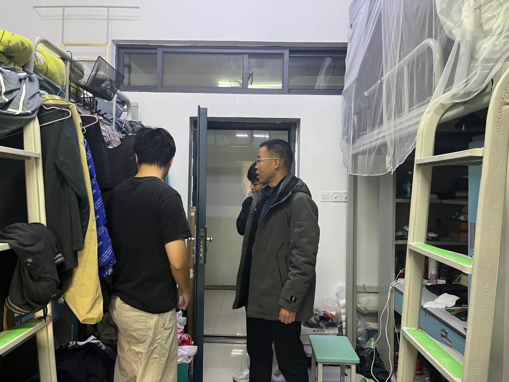 分管研究生副院长孔翔飞,研究生辅导员马亚博和研究生会成员深入雁山校区30#、31#、32#研究生宿舍进行安全专项检查。