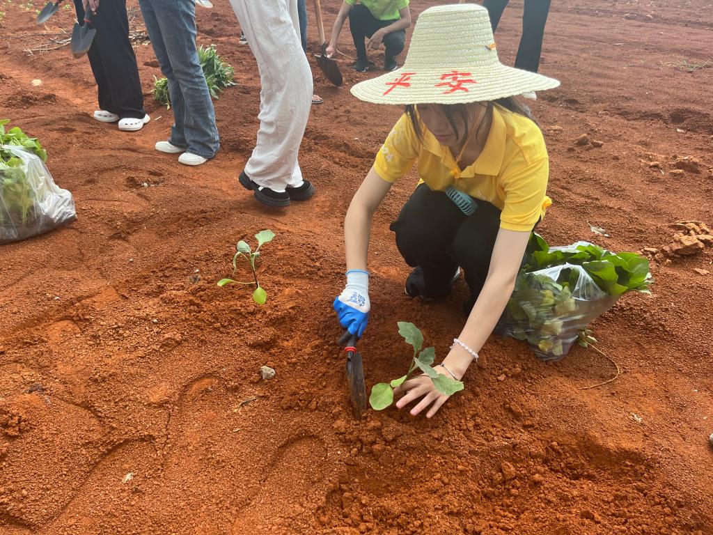 活动现场,马亚博老师手持农耕用具,为同学们生动讲解其分类、使用技巧及操作注意事项,她还结合“百草耕读园”的种植规划,深入浅出地为同学们传授西红柿、芋头、黄瓜等不同农作物的种植知识,并强调劳动安全要点,为实践活动筑牢安全防线。随后,学校后勤集团服务中心老师示范了翻土、栽种、浇水、施肥等关键劳动环节,一铲一锄间,蕴藏着农耕智慧,一招一式中,传递着劳动匠心。尽管烈日炎炎,却丝毫不减同学们的劳动热情,他们以小组为单位,迅速分工协作,投身于秧苗栽种、施肥、浇水的劳动实践中。在同学们的辛勤耕耘下,一颗颗秧苗挺立田间,承载着收获的希望。同学们纷纷表示,通过团队合作完成种植任务,不仅收获了劳动技能,更深刻认识到了劳动的重要性与价值。