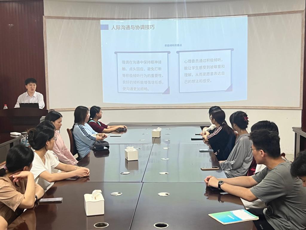 随后,朱皓开展了朋辈帮扶能力培训。他结合具体案例,从朋辈心理辅导的技巧、倾听与沟通的方法、常见心理问题的应对策略等方面进行了深入讲解,并强调心理委员要充分发挥朋辈优势,主动关心身边同学,给予他们情感支持和实际帮助,成为同学们信赖的“知心人”。