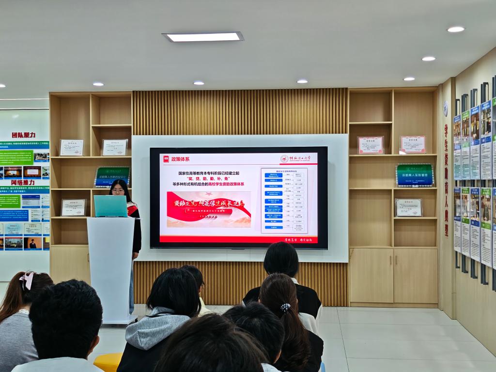 活动伊始,学校学生资助宣传大使陆鹏飞对学校资助育人实践基地的功能和作用进行了全面介绍,为同学们搭建了一个全面了解资助政策的平台。随后,何灿丽、韦砚俊、杨兰雨等3位同学对国家和学校的各项资助政策进行了深入解读,内容涵盖奖学金、助学金、国家助学贷款、勤工助学、参军入伍及基层就业学费补偿贷款代偿、学费减免等多种形式的内容,为大家答疑解惑。