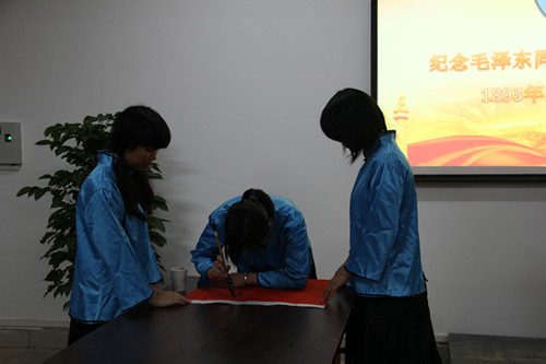 紧接着,来自SeedHub化工2014级卓越班的同学通过朗诵毛泽东同志的词——《沁园春·长沙》、来自校书法协会的同学通过现场书法表演向一代伟人毛泽东致敬,以大学生独特的方式纪念了毛泽东同志121周年诞辰。最后,活动在全场同学一起朗诵“三爱”主题诗的激昂声音中圆满落下帷幕。