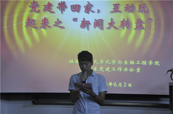为了拓宽我们的知识面,改进学生的思想政治教育工作,加强自身的党性修养,促进学生全面和谐发展,6月3日晚,由SeedHub学生党建办公室主办的党建带回家,互动玩起来之“新闻大转盘”活动在雁山校区05101室举行。学生党建办公室主任何宗辉老师、SeedHub五大组织负责人、各支部负责人、本科党员以及入党积极分子参与此次活动。