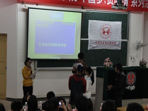 在知识问答赛上,杨建辉老师首先发言,他希望同学们能从比赛中互相学习、交流,共同提高,把国家资助政策宣传到位,并举例说明了银行征信系统对同学们今后学习生活的重要性。随后比赛正式进行,由前期352名同学海选出来的11位选手充分发挥自己的聪明才智以及平时对资助政策的知识积累,比赛异常激烈,精彩不断。最后来自生物12-2班的郑忠程同学站到了最后,收获了冠军。