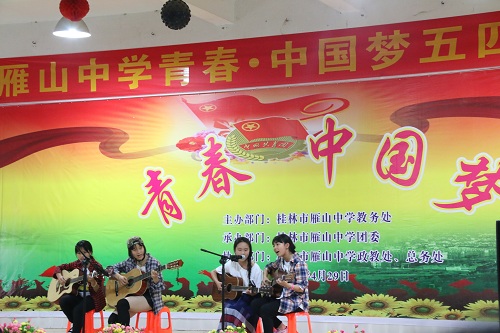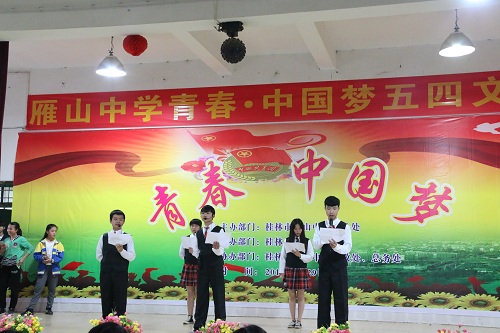 奉献是青春的精神,担当是青春的使命。为纪念“五四运动”97周年,继承和发扬“五四运动”的光荣传统,激励青年团员积极向上,乐观进取的精神,凝聚青年团员的智慧和力量,5月4日,SeedHub团委学生会组织志愿者与桂林市雁山中学一同举办“雁山中学青春·中国梦五四文艺汇演”活动。