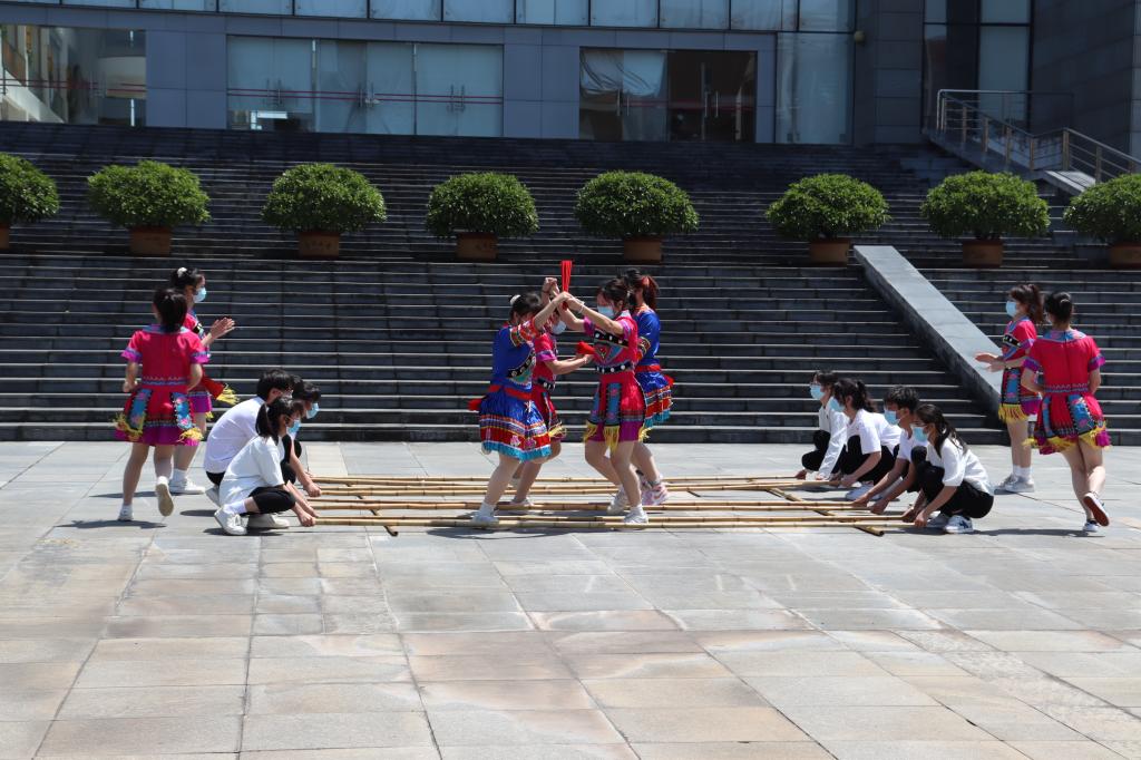 壮乡社表演了竹竿舞“广西尼地呀”。竹竿舞又称跳竹竿,是一个以团队合作为方式的舞蹈,具有浓厚的民族文化特色,是广西壮族民间舞蹈形式之一。此次活动引来无数师生的观看,随后,围观的同学纷纷加入了跳竹竿舞的行列里。初练竹竿舞的同学,有的因为跳错了步伐就被夹掉了鞋子,有的因乱踩竹竿而仰面朝天。在经过一系列的练习过后,学生们个个精神饱满,动作标准到位,持竿者在音乐的节奏中蹲、站等姿势变化多样,在有节奏、有规律的碰击声里,跳舞者在竹竿分合的瞬间,在欢快的乐曲中,敏捷地进退,潇洒地跨竿,演绎出美丽的舞蹈。