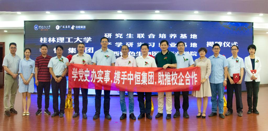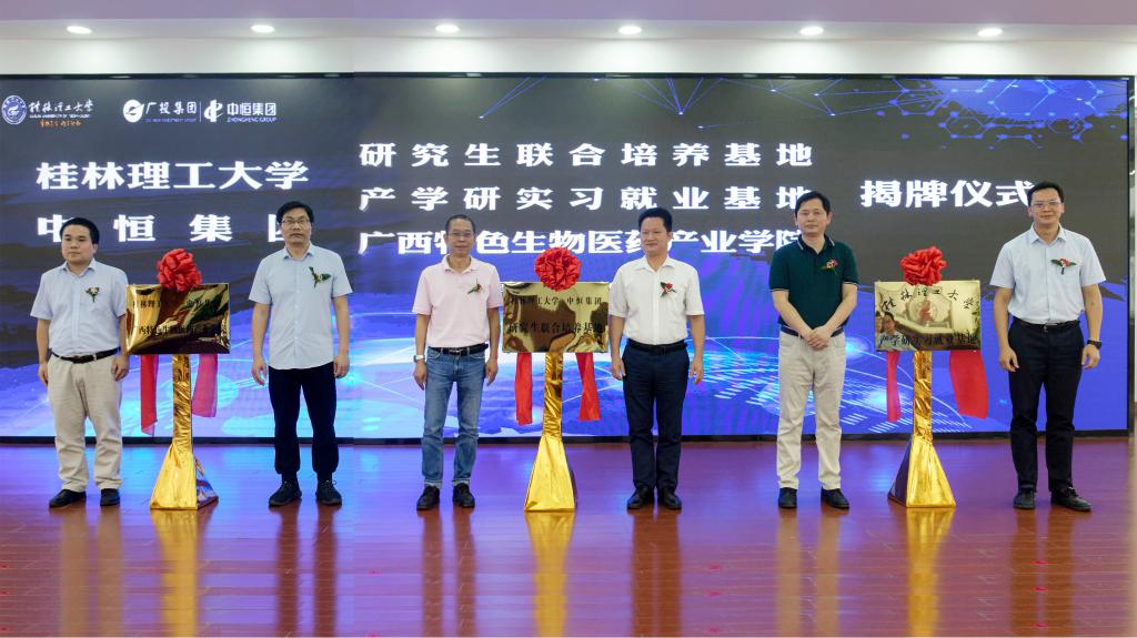 的到访表示热烈欢迎,并对双方开展的深度合作表示由衷期待。他表示,中恒集团与学校合作的初心不变,希望与学校在人才培养、产学研融合、实习就业等方面进行深度合作。随后,集团代表与学校代表共同上台,为研究生联合培养基地、产学研实习就业基地、广西特色生物医药产业SeedHub