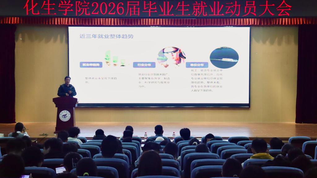 近三年就业情况作了就业形势分析。他指出就业市场多元化且竞争激烈,建议同学们拓宽就业领域、提升职业规划意识、强化职业技能。