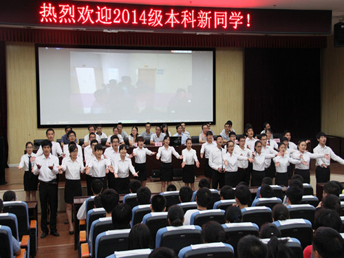 历史、师资力量、教学与科研平台以及取得的成绩等方面作了详尽介绍。同时,李院长还对新生提出了几点希望,希望他们尽快转换角色,树立目标,适应大学生活。议程第二项,老生代表院学生会主席边晓寒同学发言,他从自己大一入学讲起,向新生介绍了丰富多彩,又充满挑战和机遇的大学生活,让新生队大学生活充满了向往。议程第三项,新生代表郭远强同学发言,他从自己入校的亲身感受谈起,勉励大家不忘自己十年寒窗苦读,珍惜大学生活,创造美好人生。议程第四项,教师代表李延伟老师发言,他向新生们讲述了自己的求学之路,勉励新生珍惜大学时光,练就扎实本领,攀登科学高峰。最后党委书记梁军作讲话,他首先对2014级新生的到来表示热烈的欢迎,随后他用诙谐幽默又充满激情的话语对新同学提出了几点要求,希望同学们格物致知,用不竭求索的精神刻苦学习;诚意正心,用奋发进取的拼搏砥砺品行;修身齐家,用不断提升的素质完善自我;治国平天下,用创新创造的能力担当重任。最后新生见面会在团委学生会合唱《相亲相爱一家人》温馨愉快的歌声中圆满结束。