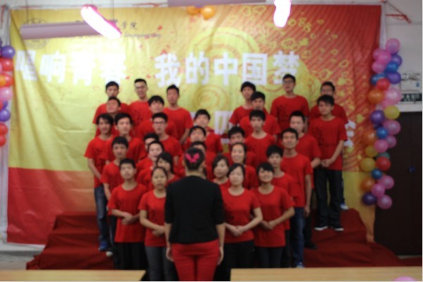在主持人宣布活动正式开始后,杨晓老师做开场致辞,他对同学们近段时间以来的辛苦练习表示赞扬,希望同学们通过本次歌咏比赛能够增进班级同学之间的感情,增强班级凝聚力,并预祝本次红歌会比赛取得圆满成功。接着,十五个班级依次上台合唱,分别演唱一首红歌以及展示班级风采的班歌。他们穿着整齐的班服,精神抖擞,歌声激情嘹亮,《我的中国心》铿锵低沉,带着些许愁思,生动的表达着游子心中不可磨灭的爱国之情,《唱的响亮》悠扬清脆,清越嘹亮,表达了同学们心中对于未来生活的憧憬与激情,和对青春无限的热爱…时而雄壮时而优美的旋律,引来观众阵阵掌声,晚会一次次被推向高潮,这些歌声犹如青春的礼花,绽放在这个初夏的夜空。