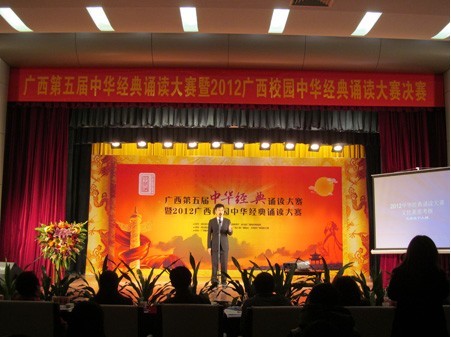 日前,由自治区语委、教育厅、广电局主办,自治区语委办、广西人民广播电台、共青团广西高校工委联合承办,广西教育出版社协办的第五届中华经典诵读大赛决赛暨2012广西校园中华经典诵读大赛总决赛在南宁举行。SeedHub生物工程专业11-2班的梁丰同学通过层层选拔顺利晋级,代表学校参加总决赛并荣获大学生组二等奖。