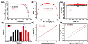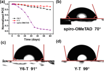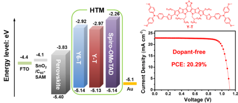 目前有机/无机杂化钙钛矿电池(PSCs)发展迅猛,其光电转化效率(PCE)已经突破了25%。空穴传输材料(Hole transport materials, HTMs)作为钙钛矿电池的重要组成部分之一,对器件的效率、稳定性以及大规模应用具有至关重要的影响。目前高效率的PSCs通常选用成本昂贵的spiro-OMeTAD作为空穴传输层,但是spiro-OMeTAD需要采用锂盐、钴盐、叔丁基吡啶等掺杂剂来提升其迁移率和导电性,这些亲水分子不利于电池的稳定性,因此低成本免掺杂空穴传输材料的开发对于高效稳定PSCs的商业化非常重要。海杰峰副教授和尹新星博士等人首次将具有缺电子属性的DA’D大稠环作为中心核和三苯胺单元作为端基构建了两个新型HTM材料Y6-T和Y-T。两个小分子材料具有匹配的能级、高空穴迁移率以及较好的疏水性。经钝化处理的基于Y-T免掺杂空穴传输层钙钛矿电池展现出令人满意的20.29%效率,高于基于Y6-T电池(18.82%)和基于spiro-OMeTAD电池(19.24%)。同时基于这两种HTMs的电池器件表现出比spiro-OMeTAD电池更加优异的稳定性。这项工作为免掺杂HTM材料提供了一种有效的设计策略,同时对钙钛矿电池商业化起到一定的推动作用。