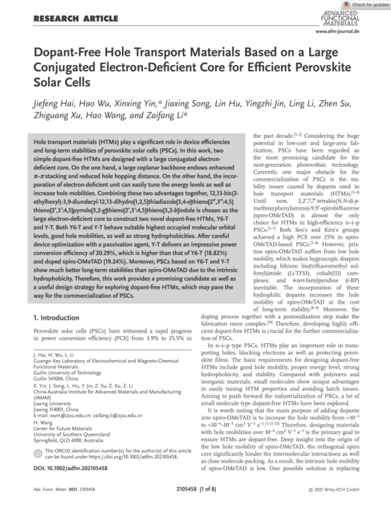 中澳先进材料与制造研究院尹新星博士课题组在免掺杂空穴传输材料修饰的钙钛矿太阳能电池方面取得重要研究进展。9月21日,该研究成果以“Dopant-Free Hole Transport Materials Based on a Large Conjugated Electron-Deficient Core for Efficient Perovskite Solar Cells”为题在《Advanced Functional Materials》(SCI一区TOP期刊,影响因子18.8)上发表。