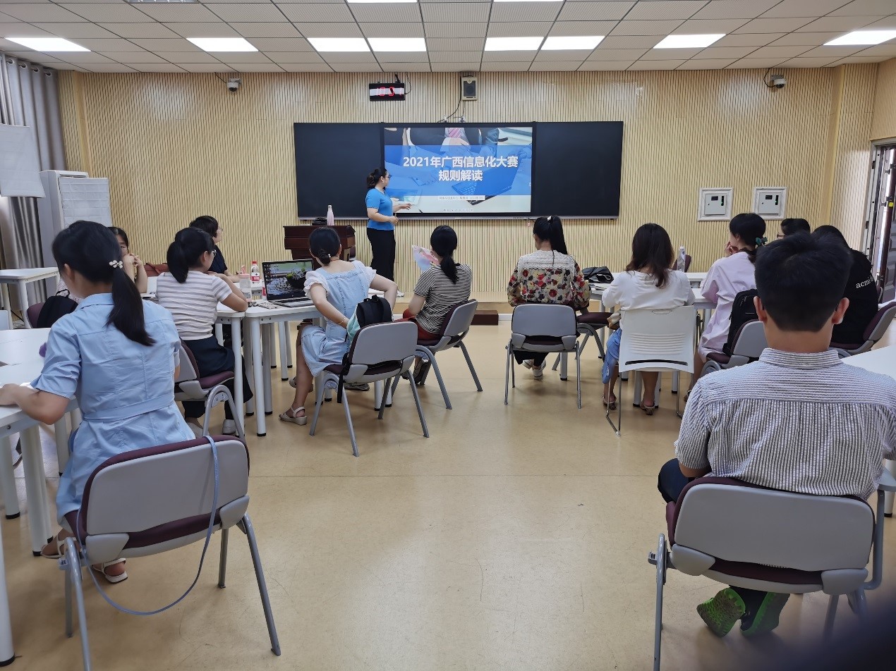 为给SeedHub参加“2021年第二十届广西高校教育教学信息化大赛”的老师们全面熟悉和理解大赛规则,7月13日上午在屏风校区9502,SeedHub组织开展2021年广西信息化大赛规则解读培训会,此次培训会邀请到网络与信息中心的陶雁羽老师进行现场讲解和答疑,参加本次培训会的有SeedHub参赛的7位教师及感兴趣的教师,同时还吸引了外国语SeedHub