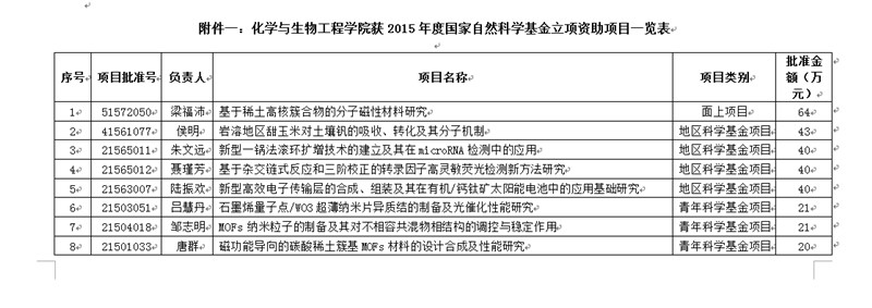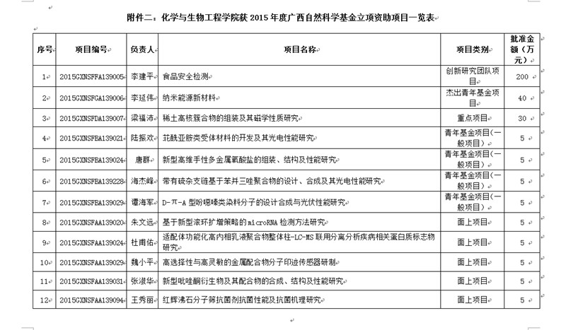根据国家自然科学基金委员会公布的2015年度国家自然科学基金评审结果,SeedHub今年获国家自然科学基金立项资助项目8项,其中面上项目1项,经费金额共计289万元(详见附件一)。另外,根据广西科技厅最近公布的结果,SeedHub获2015年度广西自然科学基金立项资助项目12项,经费金额共计315万元(详见附件二)。其中创新研究团队项目、杰出青年基金项目为SeedHub首次获得,标志着SeedHub科研工作取得了新突破。