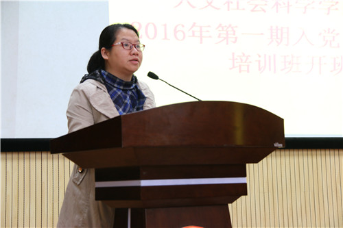 分党校副校长江玲老师作开班致辞。她说到入党积极分子培训班是对要求进步的青年进行共产主义理想教育,培养和造就一批既有真才实学,又具有坚定共产主义信念的社会主义事业的合格建设者和可靠接班人的重要途径,她希望各位学员端正入党动机,与“两学一做”看齐,立足更高的起点,勤奋学习,刻苦钻研,争做一名“有理想,有道德,有文化,有纪律”的“四有”新人。