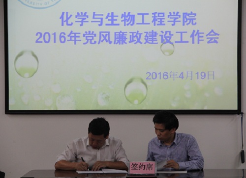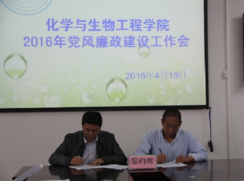党委书记梁军(右)与生物工程教工党支部书记李培骏(左)签订2016年党风廉政责任状