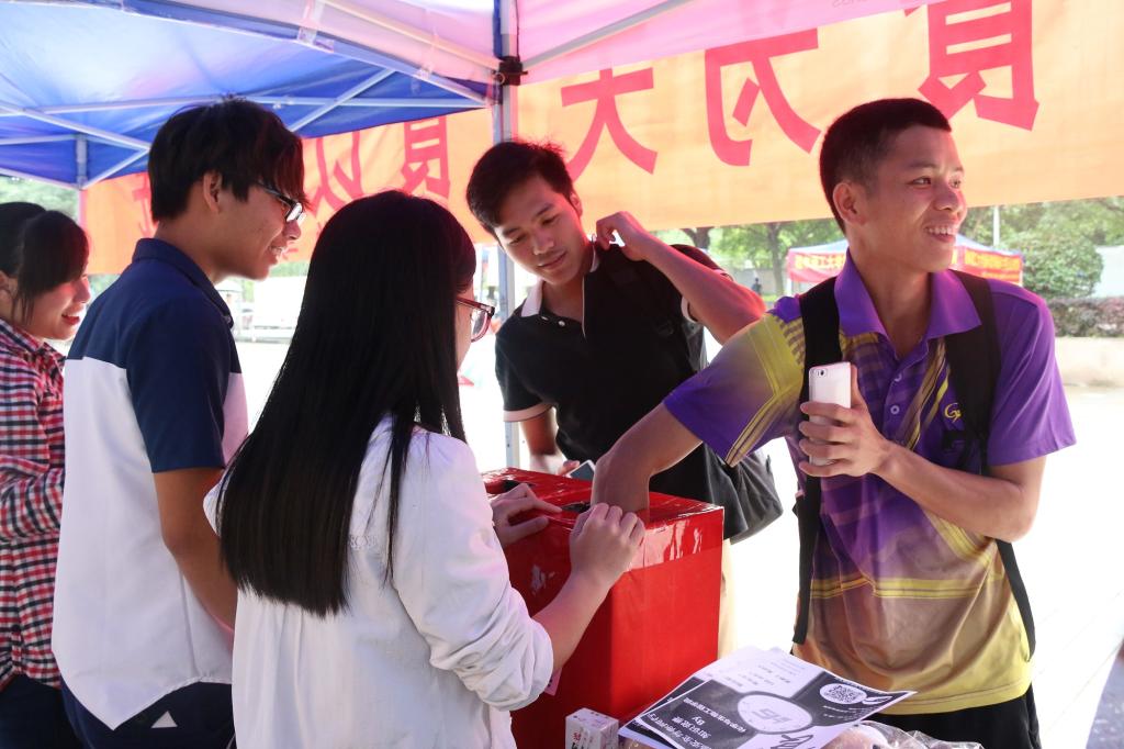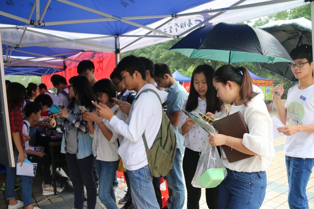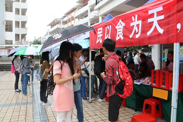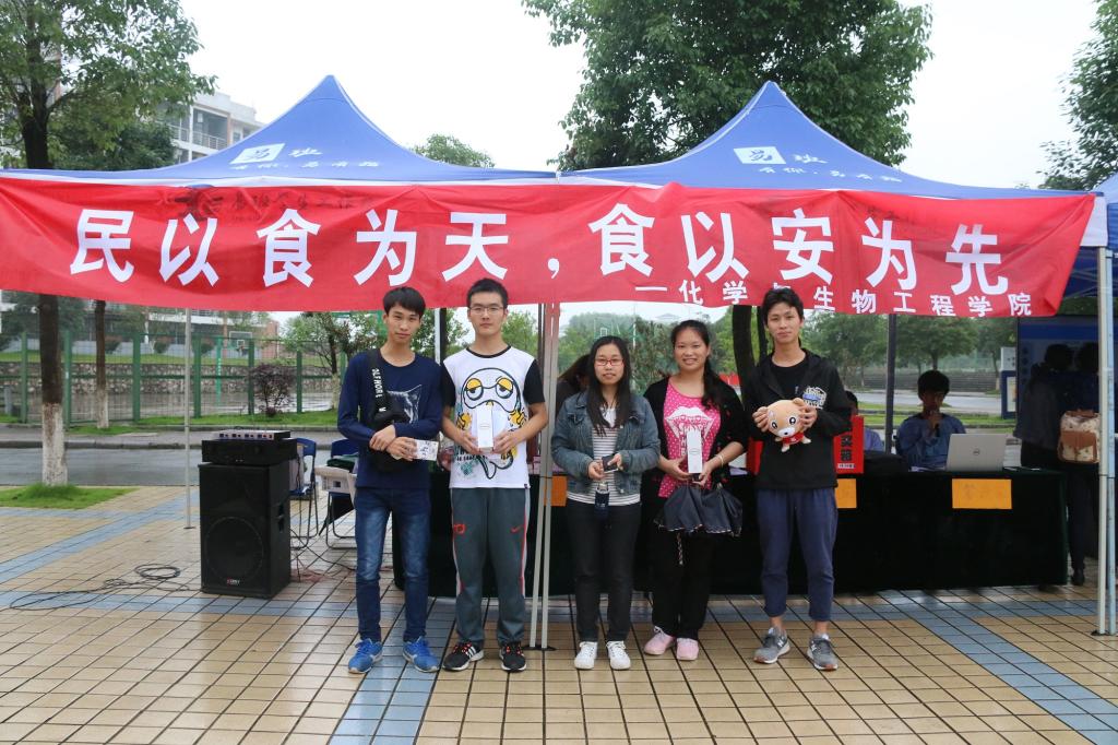 本次“食品安全知识竞答”活动主要通过三种途径开展,一是易班动态集赞活动,同学们通过转发本次活动信息以获得好友点赞,集够一定数量可到现场兑换相应奖品,通过好友集赞,为活动的开展起到了较好的宣传效果;二是线上答题:同学们通过在手机易班客户端添加《舌尖上的安全》轻应用进行答题,以正确率及用时长短作为评判标准,活动截止后,将通过易班平台公布获奖名单;三是线下答题环节,23、24日,SeedHub分别在一号、二号食堂进行设点宣传,这才是真正的较量,现场答题精彩纷呈、5-10人轮番限时答题,总有人在答题刚开始就遭遇失败而被终止游戏,只获得三等奖的抽取机会,可见大家对“食品安全知识”的缺乏,但也不乏有一路“过关斩将”的大神,连续答对,赢得抽取一等奖的资格,桂工纪念版U盘、印有易班logo的水杯下一秒就在大神手中。期间,虽然雨落纷纷,却没有阻碍大家积极参与的决心,更没有淋湿大家答题抽奖的热情。