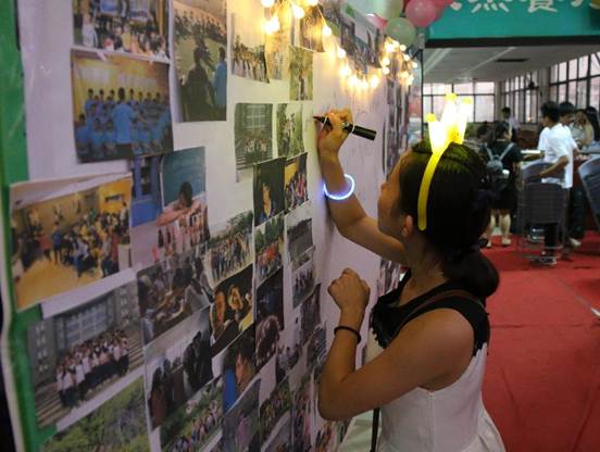 回忆,在乐器合奏的《友谊地久天长》下,涌上心头。回望青葱岁月,《朋友》你已成为我生命中不可或缺的一部分,一句话一辈子,一生情一杯酒,我们《不说再见》;在抽奖环节,幸运的毕业生们得到了特别定制的桂工纪念品:一张留有何老师亲笔寄语的明信片。手中的明信片虽轻,心里装满的情意却沉甸甸。接着,会场的灯灭了,幕布上渐渐浮现了一些画面:大学是我们人生旅程的一个驿站,四年生活漫长却又短暂,四年里每个人逐渐蜕变,并走向成熟,不同的人获得了不同的经验。那些一起走过的路,一起奋斗过的岁月,哭过,笑过,四年的校园生活历历在目。