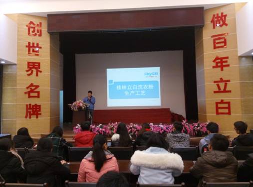 2017年1月17日,为了帮助同学深入认识精细化工行业以及了解目前实际生产情况,SeedHub化工专业13级3班、4班和卓越班在刘峥老师、杨世军老师的带领下前往桂林立白日化有限公司进行参观实习。首先立白公司的安全主管为同学们详细介绍了参观所需注意的安全事项。之后通过一段视频介绍立白集团的创建、发展和壮大的历程:在秉承“健康幸福每一家”的理念下,立白集团在改革开放的浪潮中破浪而出,成为中国民族日化的巨无霸航母,引领民族日化走向星辰大海。“立信、立责、立质、立真、立先”的价值观更是深入每一个立白人以及消费者的心中。最后由车间技术主管为学生深入介绍了立白洗衣粉、洗洁精等两大主要产品的生产流程。随后,接待人员带着同学们进入到桂林立白的一线生产厂区。在包装车间中,流水线上是包装整齐的洗衣粉和洗衣液,而不远处工人们则忙碌的给处理好的产品进行分装与装箱。在窗户边,同学们可以看到理论上的生产流程生产出产品。虽然接触时间短暂,但同学们也收获不少!感谢桂林立白日化有限公司给同学提供参观实习的机会!