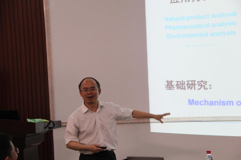 报告中,潘远江教授深入浅出地介绍了质谱技术发展历史、基础知识以及其在环境分析、食品分析、药物分析、生命分析、成像分析等方面的应用。重点介绍了其团队采用质谱技术研究化学反应过程相关机理及所取得的研究成果。他和团队成员采用现代质谱技术准确捕获了药物合成过程中的中介体,发现了质谱分析过程中物质碎裂的一些新规律,取得了令人瞩目的成果。在互动环节,师生们踊跃提问,潘教授一一对所有问题给出了细致的解答。潘教授对在场同学们的热烈互动、认真思考给予了很高的评价。