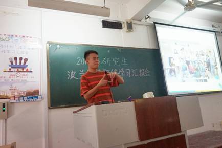 汇报会伊始,先由程珍芳同学从学校简介、学习生活、地域文化、经验总结四个方面介绍了波兰弗茨瓦夫理工大学访学的基本情况。程珍芳同学从国外如何保持实验室以及住宿房间干净整洁这一细节展开,强调对细节的重视及养成良好习惯的重要性。讲到国内外学习科研的差异,程珍芳同学感悟:仪器设备的原理都是一样的,明白自己想要做什么最重要,重点是在于创新思维,发散思维。王浩同学在随后的分享中做了更加具体的补充,从货币的兑换、乘机的技巧、电话卡、信用卡的办理到语言、美食、购物、地标建筑等,介绍了许多波兰的历史文化知识,同时介绍了申请到海外研修的基本条件与准备工作,鼓励大家争取机会到外边的世界去看看,增长见识。