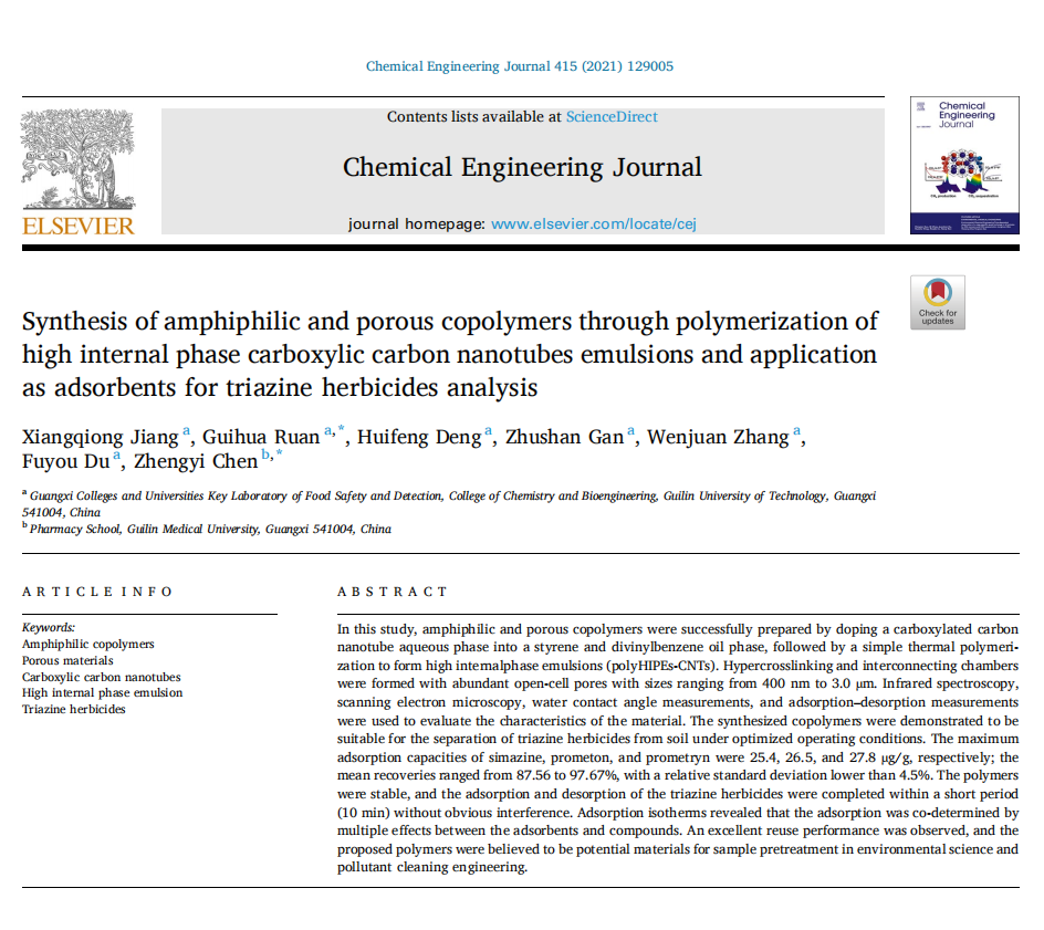2021年春季学期开学前夕,SeedHub阮贵华研究员团队在多孔聚合物材料的制备及其应用研究传来好消息,其团队的研究成果——题为“Synthesis of amphiphilic and porous copolymers through polymerization of high internal phase carboxylic carbon nanotubes emulsions and application as adsorbents for triazine herbicides analysis”的论文被化学工程类国际知名期刊Chemical Engineering Journal(IF=10.652)录用并正式发表。