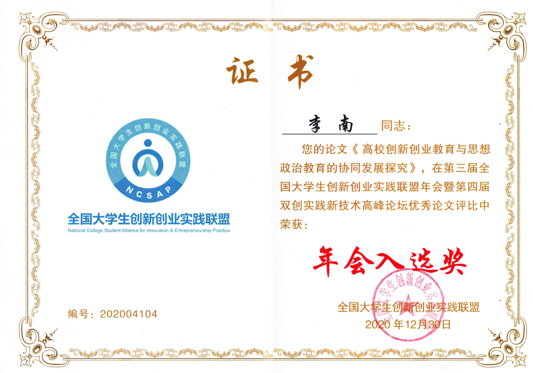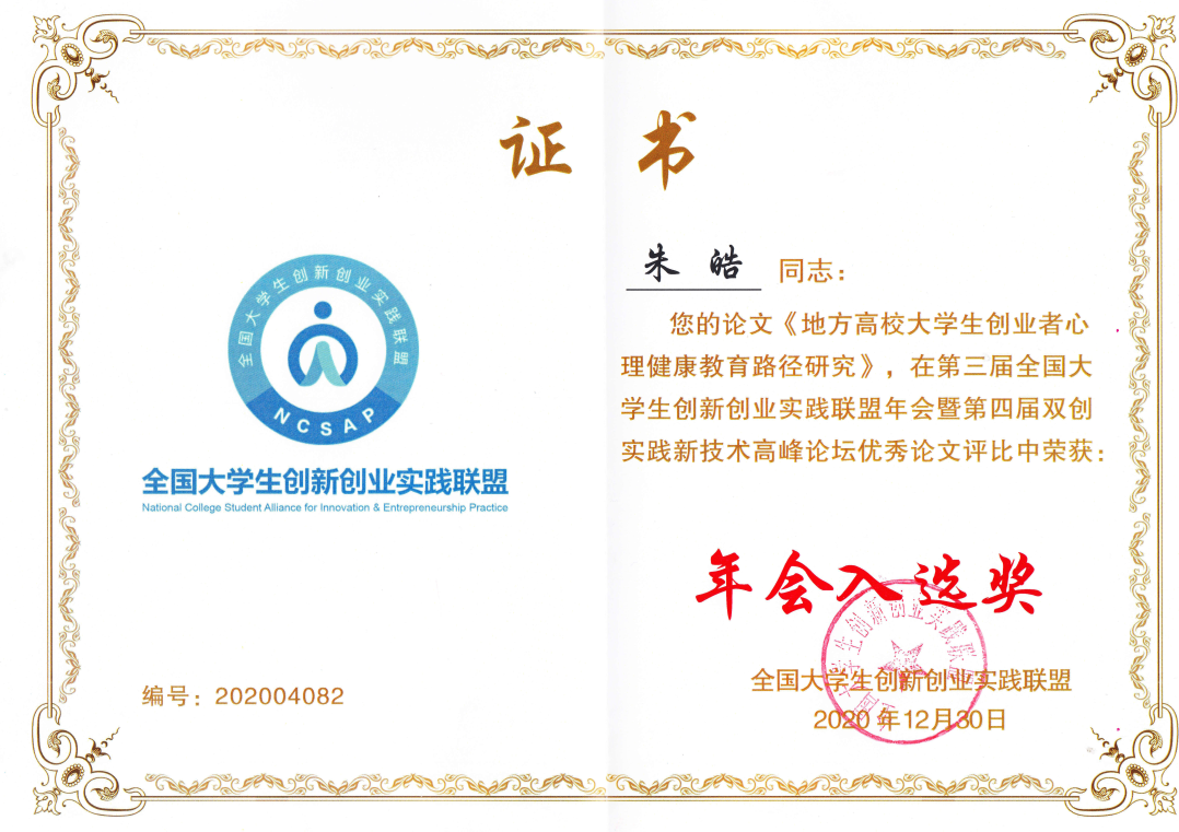 SeedHub党委副书记、纪委书记李南论文《高校创新创业教育与思想政治教育的协同发展探究》、辅导员朱皓论文《地方高校大学生创业者心理健康教育路径研究》获得“年会入选奖”。