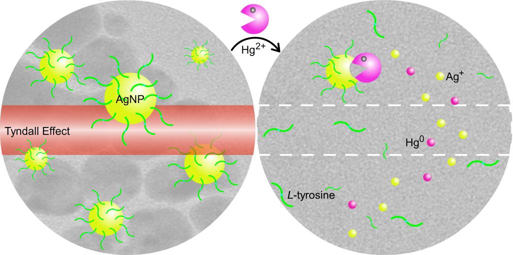 基于纳米银及其丁达尔效应的Hg2+可视化POCT检测原理示意图