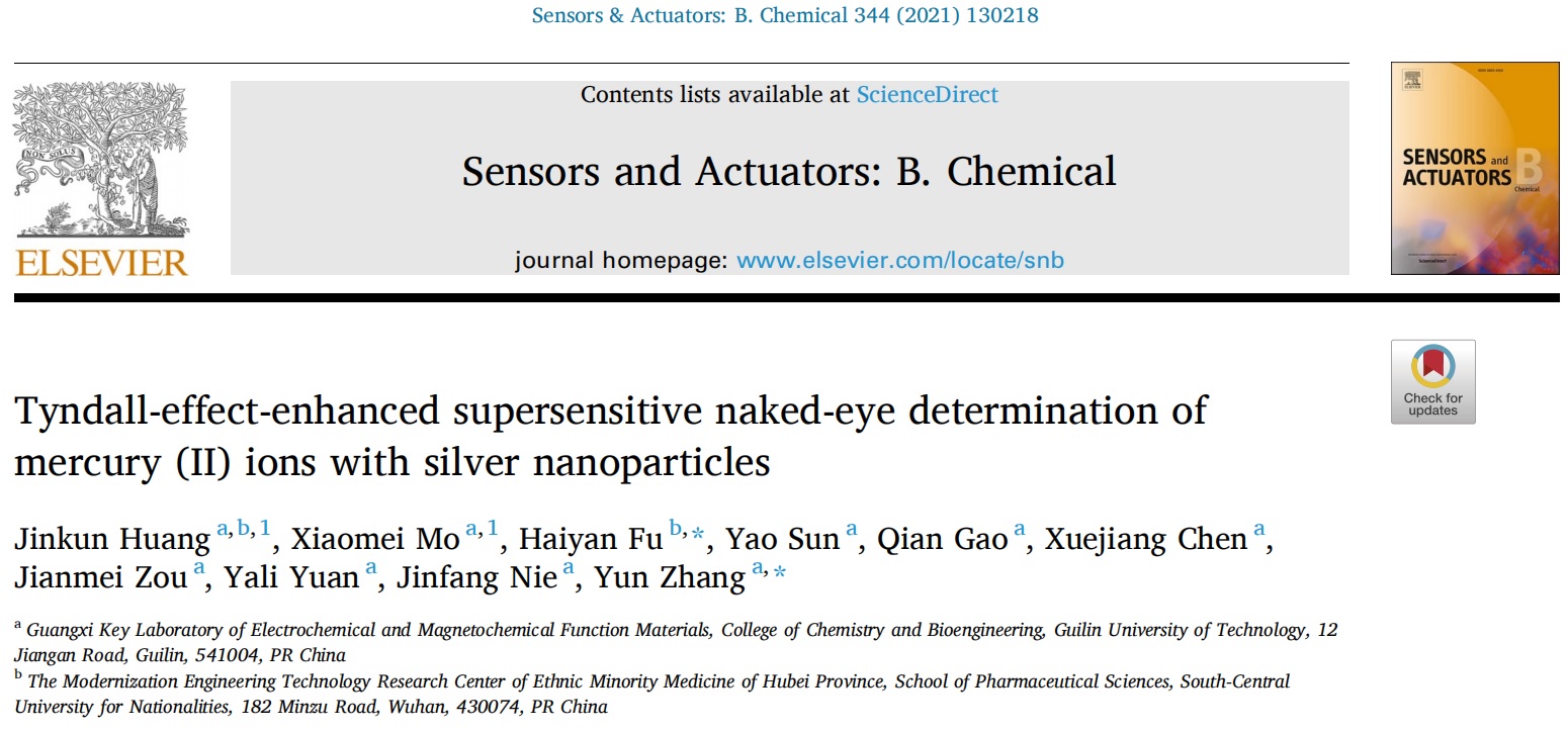 近日,SeedHub张云教授课题组和中南民族大学付海燕教授课题组合作,在即时检测(Point-of-care testing,POCT)研究领域再次取得重要进展。相关成果以“Tyndall-effect-enhanced supersensitive naked-eye determination of mercury (II) ions with silver nanoparticles”为题发表在化学与生物传感领域国际著名期刊Sensors and Actuators B: Chemical(SCI一区TOP,影响因子为7.10)上。该项研究得到国家自然科学基金面上项目、广西杰出青年基金、中央引导地方科技发展资金、广西重点研发计划等项目资助。SeedHub硕士研究生黄锦坤、莫小梅为论文共同第一作者,SeedHub