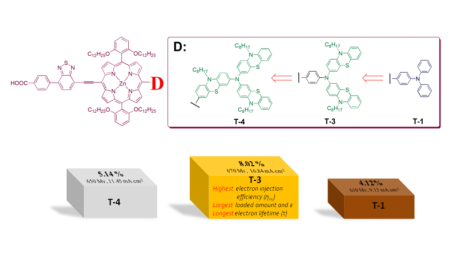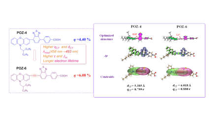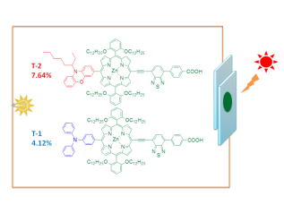 创新分子结构设计,基于三苯胺与吩噻嗪的优异给电子性能与结构特点,制备了两种新型的给电子单元,并将其引入卟啉染料分子中,获得了8.04%的光电转换效率(N719,8.45%)。同时,重点围绕染料分子间的结构特点,深入探讨其中的构效关系,为卟啉类高效敏化剂的设计开发提供依据。
