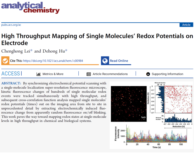 雷呈宏教授与美国太平洋西北国家实验室Dr. Dehong Hu高级研究员合作,在高通量单分子荧光光谱电化学(High Throughput Single-Molecule Fluorescence Spectroelectrochemistry)研究领域取得重要进展。相关成果以“High Throughput Mapping of Single Molecules’Redox Potentials on Electrode”为题发表在国际著名期刊美国化学会出版的Analytical Chemistry上。该刊是分析化学专业领域的顶级期刊,读者受众多,影响广泛(Top 1区)。这项工作是两位合作者继作为最早发展单通量单分子荧光光谱电化学的研究者之一十年后,又明确提出高通量单分子荧光光谱电化学的理论构想并取得实验验证的奠基性原创性论文。该项研究得到国家自然科学基金委地区基金项目、广西自然科学基金委重点项目、广西外国高端人才项目和SeedHub