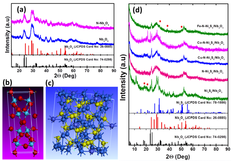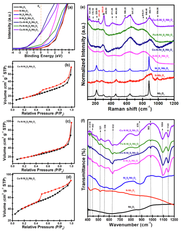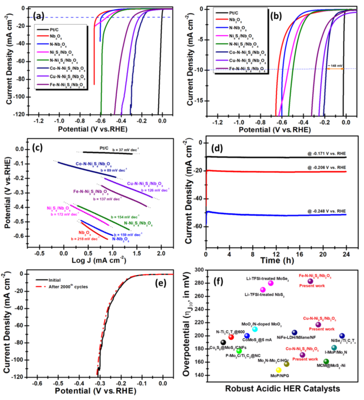 层状空间分离的异质结M-N-Ni9S8/Nb2O5(M = Co、Fe或Cu)拥有丰富的界面结构、丰富的活性中心和大的比表面积,并且通过金属与N原子共掺杂显著地调节了异质界面的局域电荷分布和电子性质。因此M-N-Ni9S8/Nb2O5拥有大表面积、固有导电性、富硫性质、异质结界面以及合理的氢吸附吉布斯自由能,这些特性使M-N-Ni9S8/Nb2O5异质结材料成为在酸或碱性介质中表现出高效稳定的析氢电催化剂。