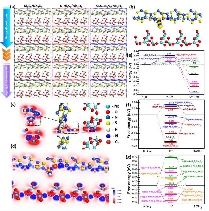 密度泛函理论计算进一步研究了M-N-Ni9S8/Nb2O5催化剂高HER活性机理,如局域态密度、电荷密度差、氢吸附吉布斯自由能变化(ΔGH*)和碱水离解势垒。理论计算结果表明在高pH值中的电催化HER活性主要取决于M-Had相互作用和水解所需的能量,而在低pH值中由于H质子(H*)十分丰富,因此电催化HER活性取决于M-Had键强度。通过原子轨道的重叠和费米能级的偏移发现当引入不同电负性的金属和氮等杂原子时,可以有效改善异质结构的局部原子排列和电子构型,使电荷转移动力学和异质界面的电子迁移率得到提升。PDOS计算表明p带中心向较低能量值上移,体现出H*的结合强度较低,这有利于H*在S位置释放,并且S原子降低的电子密度也可以促进H*从S位置的解吸。通过估算水分解势垒发现异质结构界面处可能发生水分解(即H2O分解成Had/OHad),而O-H键断裂显著增加了H*的浓度,从而增强了碱性HER性能。氮和金属原子的共掺杂使催化剂的水解动能势垒显著降低,同时DOS结果表明,共掺杂可以让催化剂的本征电导率增加。