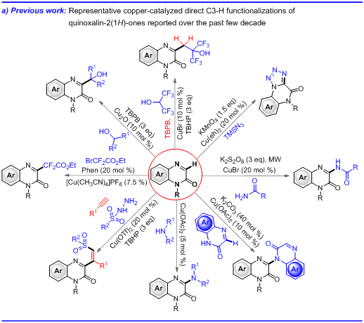 图1 铜催化喹喔啉酮C3-H官能团化反应的研究背景