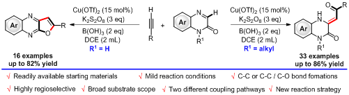 图2 铜催化喹喔啉酮与炔烃的选择性偶联反应