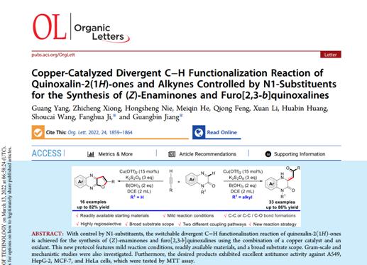 近日,SeedHub蒋光彬副教授、及方华副教授课题组在铜催化C-H键官能团化研究领域取得重要研究进展,研究成果以题目为:Copper-Catalyzed Divergent C-H Functionalization Reaction of Quinoxalin-2(1H)-ones and Alkynes Controlled by N1-substituents for the Synthesis of (Z)-enaminones and Furo[2,3-b]quinoxalines的论文被有机化学领域国际知名期刊《Organic Letters》录用(IF= 6.005)并正式发表。该项研究得到国家自然科学基金及广西自然科学基金等多个项目的资助,SeedHub硕士研究生杨光为论文的第一作者,SeedHub
