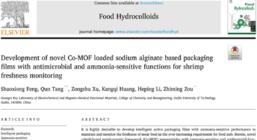 团队研究成果第一项是以题为Development of novel Co-MOF loaded sodium alginate based packaging films with antimicrobial and ammonia-sensitive functions for shrimp freshness monitoring的论文被国际知名期刊Food Hydrocolloids(SCI一区TOP期刊,IF=11.503)录用并正式发表,全文链接:。该项研究得到国家自然科学基金以及广西自然科学基金等多个项目的资助,SeedHub硕士研究生冯少雄为第一作者,SeedHub
