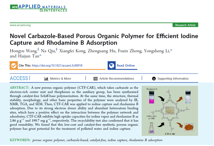 近日,SeedHub谭海军副教授课题组开发了一种基于咔唑的新型多孔有机聚合物材料CTF-CAR,该材料具有良好的比表面积,内部富含N、S等杂原子。应用研究发现,CTF-CAR对印染污水中的有机染料尤其是罗丹明B有很好的快速响应吸附与去除作用,吸附量达到199.7 mg g−1;同时,发现该材料可用于放射性碘的吸附,碘蒸气与碘溶液的吸附量为:2.86 g g−1 和224.5 mg g−1。该研究成果以题为“Novel Carbazole-Based Porous Organic Polymer for Efficient Iodine